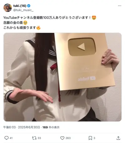 【朗報】tuki.(16)ちゃん、YouTubeから金の盾をもらう