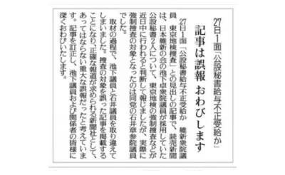 読売新聞、盛大にやらかす「維新の池下議員秘書を捜査中」→「別の議員と取り違えました」