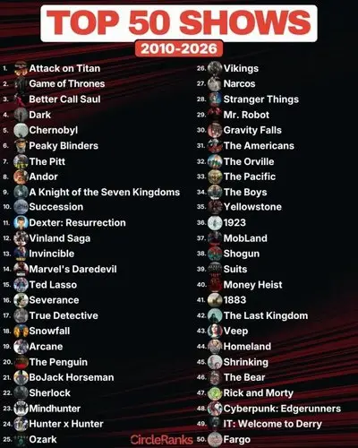 【画像】ここ15年で最も優れたドラマランキングTOP50、進撃の巨人がゲースロを抑えてまさかの1位に