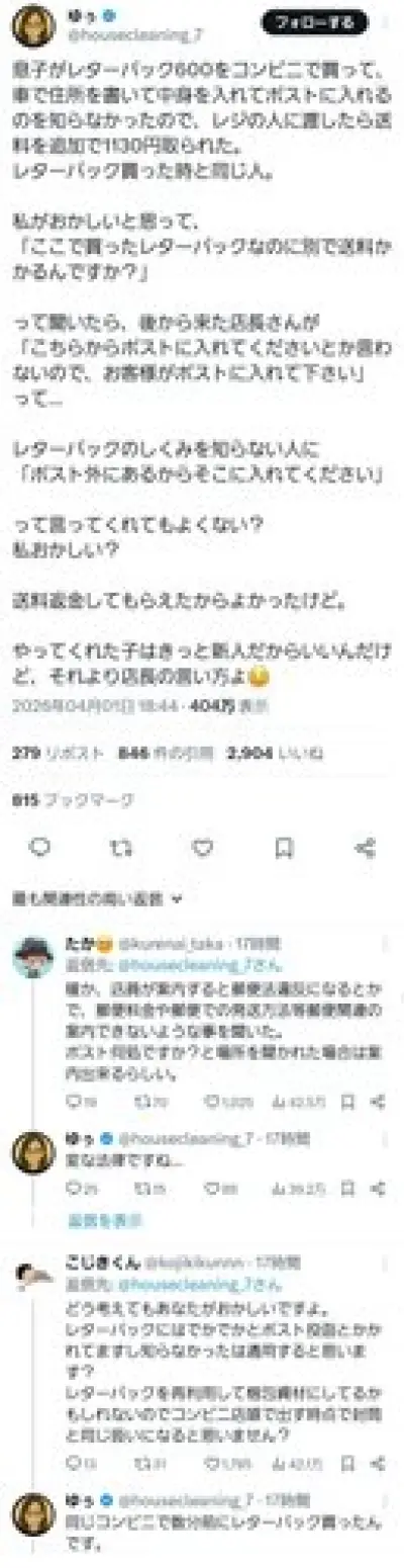 【悲報】女さん「レターパック買ってコンビニで渡したら送料取られた!私おかしい?」→大炎上