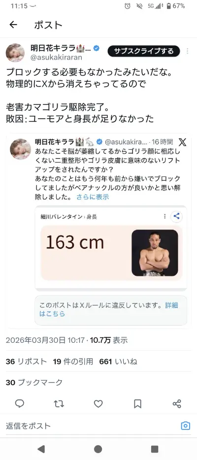 【画像】明日花キララさん、元ボクシング日本王者(163cm)とXでガチのレスバをしてしまうwwwwwwwwww