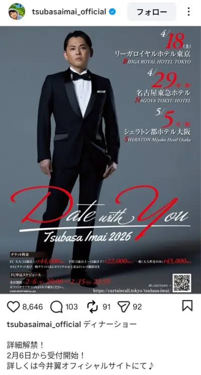 【画像】今井翼(44)「ディナーショーやるけど需要ありゅ?ちな44000円」