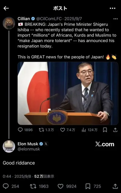 【画像】イーロン・マスク、石破退任の報道を受け「清々した」とポストしていた