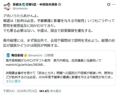 中道、高市のカタログギフト問題を徹底追及へ「許される事じゃない。責任を取らせる」←違法じゃないなら問題ある?