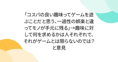「コスパの良い趣味ってゲームを遊ぶことだと思う、一過性の娯楽と違ってモノが手元に残る」→趣味に対して何を求めるかは人それぞれで、それがゲームとは限らないのでは?と意見