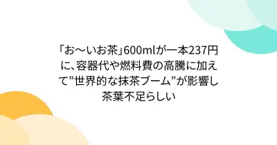 「お~いお茶」600mlが一本237円に、容器代や燃料費の高騰に加えて”世界的な抹茶ブーム”が影響し茶葉不足らしい
