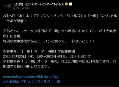 【朗報】モンハンワイルズ、一蘭とスペシャルコラボ開催!ファンからは歓喜の声!