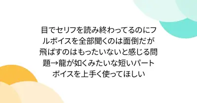 目でセリフを読み終わってるのにフルボイスを全部聞くのは面倒だが飛ばすのはもったいないと感じる問題→龍が如くみたいな短いパートボイスを上手く使ってほしい