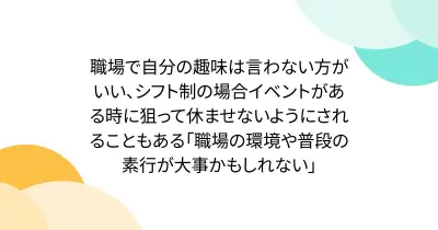 職場で自分の趣味は言わない方がいい、シフト制の場合イベントがある時に狙って休ませないようにされることもある「職場の環境や普段の素行が大事かもしれない」