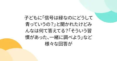 子どもに「信号は緑なのにどうして青っていうの?」と聞かれたけどみんなは何て答えてる?「そういう習慣があった、一緒に調べよう」など様々な回答が