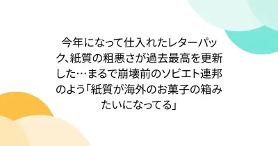 今年になって仕入れたレターパック、紙質の粗悪さが過去最高を更新した…まるで崩壊前のソビエト連邦のよう「紙質が海外のお菓子の箱みたいになってる」