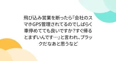 飛び込み営業を断ったら『会社のスマホGPS管理されてるのでしばらく車停めてても良いですか?すぐ帰るとまずいんです…』と言われ、ブラックだなあと思うなど