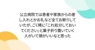 公立病院では患者や家族からの差し入れとかお礼など全てお断りしていたが、ごく稀に『これ処分しておいてください』と菓子折り置いていく人がいて頭がいいなと思った