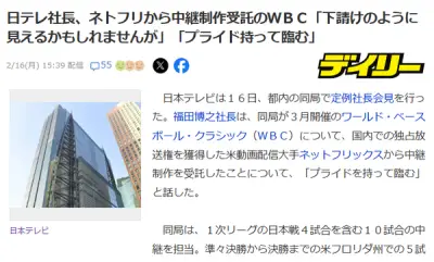 日テレ社長、ネトフリから中継制作受託のWBC「下請けのように見えるかもしれませんが」「プライド持って臨む」