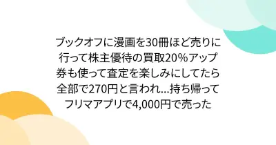 ブックオフに漫画を30冊ほど売りに行って株主優待の買取20%アップ券も使って査定を楽しみにしてたら全部で270円と言われ...持ち帰ってフリマアプリで4,000円で売った