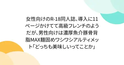 女性向けのR-18同人誌、導入に11ページかけてて高級フレンチのようだが、男性向けは濃厚魚介豚骨背脂MAX麺固めワシワシアルティメット「どっちも美味しいってことか」