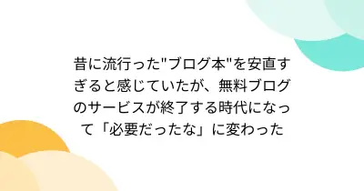 昔に流行った"ブログ本"を安直すぎると感じていたが、無料ブログのサービスが終了する時代になって「必要だったな」に変わった