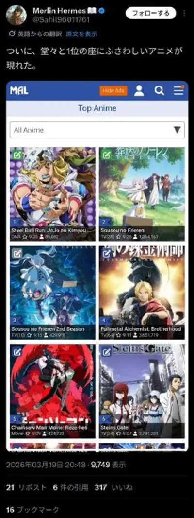 【朗報】ジョジョ7部、MALランキングで1位を獲得wwwwwwwwwwwwwwwwwwwwwwwwwwwwwwwwwwwwwwwwwwwwwwwwwwwwwwww