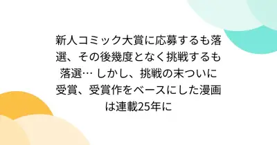 新人コミック大賞に応募するも落選、その後幾度となく挑戦するも落選… しかし、挑戦の末ついに受賞、受賞作をベースにした漫画は連載25年に