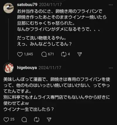 【悲報】『美味しんぼ』に影響された男さん、妻が卵焼きとソーセージを同じフライパンで作ったらブチギレ