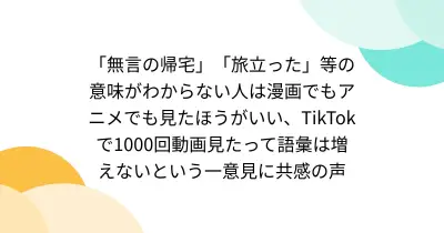 「無言の帰宅」「旅立った」等の意味がわからない人は漫画でもアニメでも見たほうがいい、TikTokで1000回動画見たって語彙は増えないという一意見に共感の声