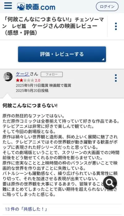 映画「チェンソーマン」、売上・評価ともに爆死。売上は50億円を大幅に下回る推移。映画評論家「TV版の良さが全て失われた駄作」
