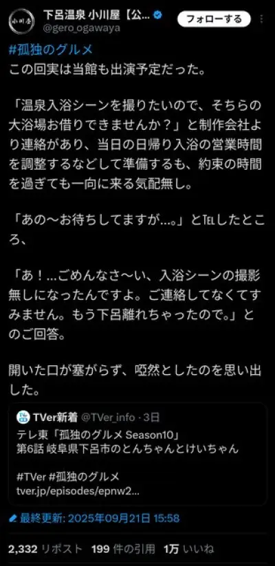 【悲報】孤高のグルメ、撮影予定(貸切)の温泉施設を連絡無しでブッチし大炎上中wwwwwwwwwwwwwwwwwwww [802034645]