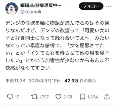 フェミまんさん、チェンソーマンを絶賛!!「デンジの性欲って加害性がなくて不快感がないから凄い」