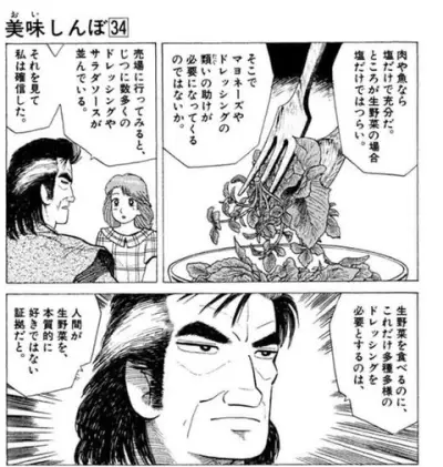 【画像】海原雄山「生野菜を食べるのにマヨネーズやドレッシングを必要とするのは人間が本質的に生野菜を好きじゃない証拠」