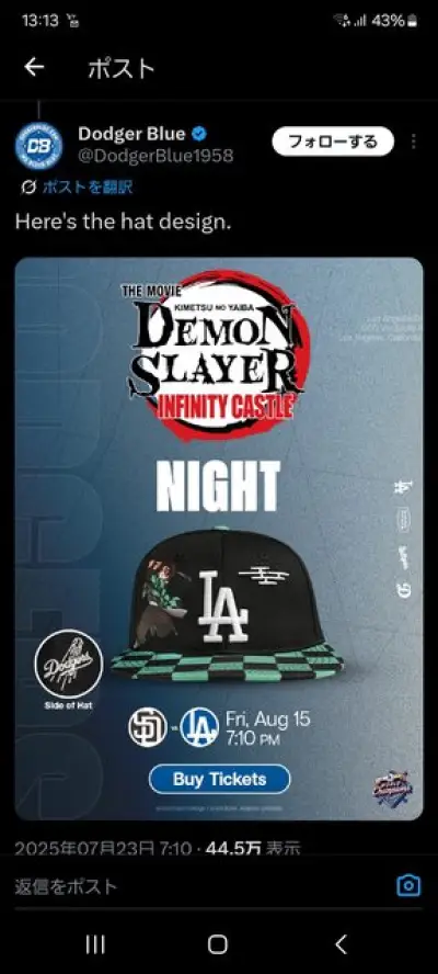 ドジャース、鬼滅の刃とコラボで特製キャップ配布wwwwwwwwwwwwwww