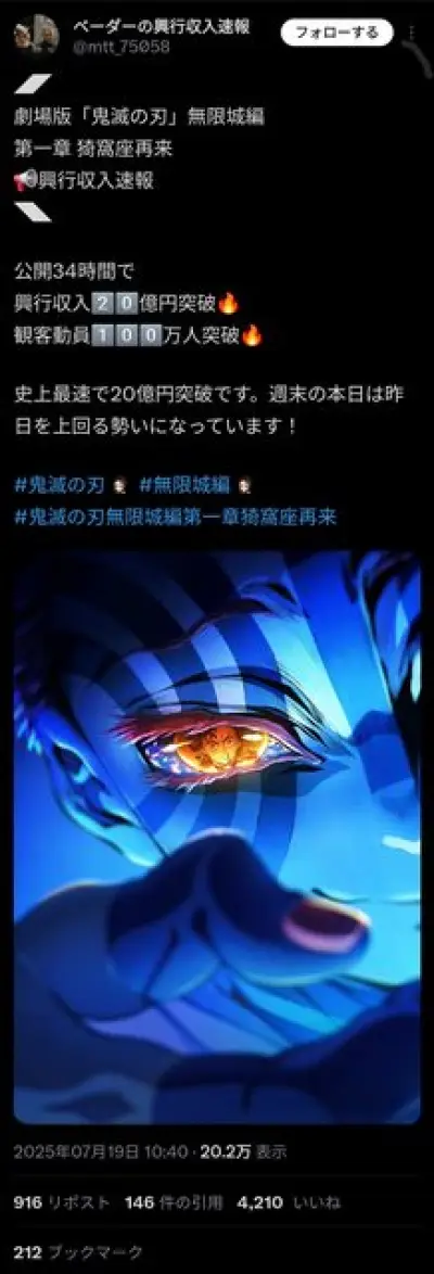 【速報】鬼滅の刃無限城編、国内史上最速で興行収入20億円突破した模様