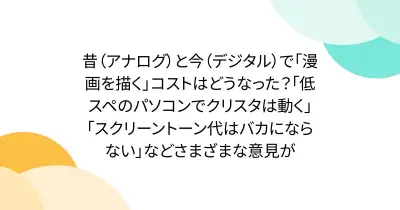 昔(アナログ)と今(デジタル)で「漫画を描く」コストはどうなった?「低スペのパソコンでクリスタは動く」「スクリーントーン代はバカにならない」などさまざまな意見が