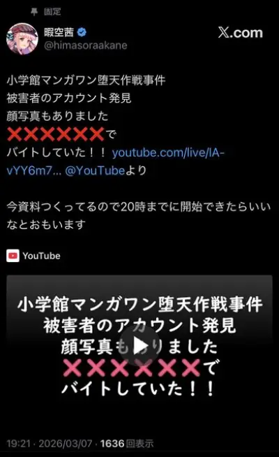 【悲報】暇空茜さん、マンガワン未成年性加害事件の被害者特定活動を開始して大炎上中……