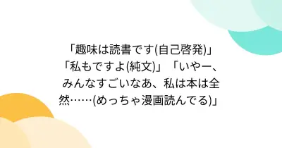 「趣味は読書です(自己啓発)」「私もですよ(純文)」「いやー、みんなすごいなあ、私は本は全然……(めっちゃ漫画読んでる)」