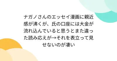 ナガノさんのエッセイ漫画に親近感が沸くが、氏の口座には大金が流れ込んでいると思うとまた違った読み応えが→それを表立って見せないのが凄い