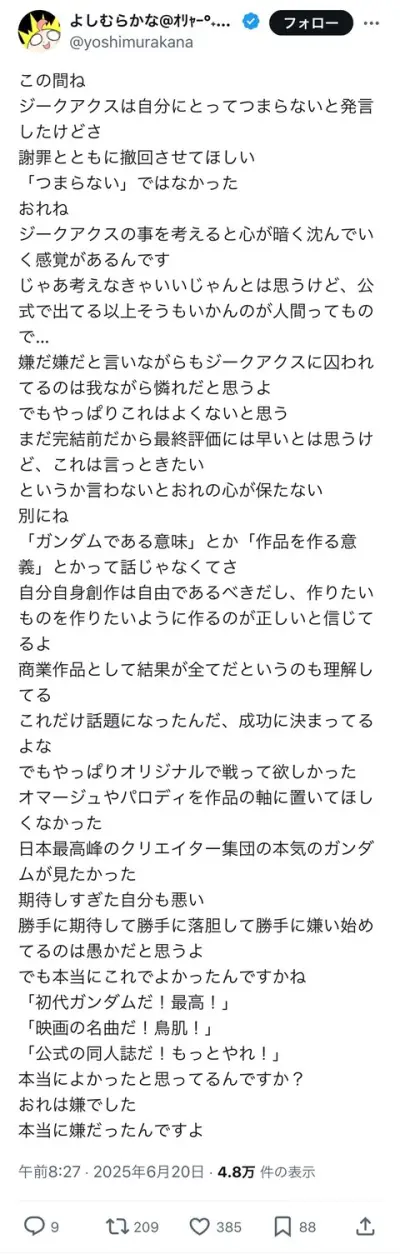 【悲報】プロ漫画家「ガンダムジークアクスの正直な感想を言います。オマージュやパロディじゃなくオリジナルで戦ってほしかった」