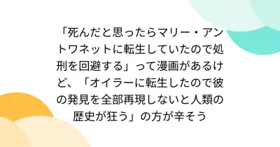 「死んだと思ったらマリー・アントワネットに転生していたので処刑を回避する」って漫画があるけど、「オイラーに転生したので彼の発見を全部再現しないと人類の歴史が狂う」の方が辛そう