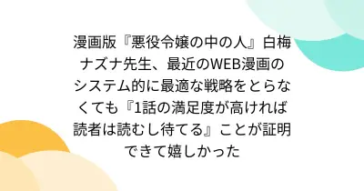 漫画版『悪役令嬢の中の人』白梅ナズナ先生、最近のWEB漫画のシステム的に最適な戦略をとらなくても『1話の満足度が高ければ読者は読むし待てる』ことが証明できて嬉しかった