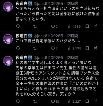 【画像】X絵師「超有名漫画家に絵を褒められた、漫画持ち込んだら担当10人に名刺貰った、でも名刺は全部なくしちゃったw」