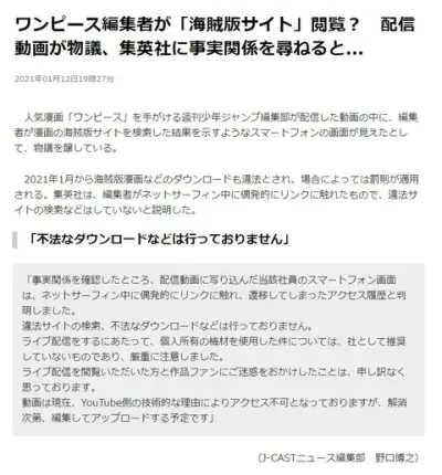 【朗報】週刊少年ジャンプの集英社「漫画の海賊版サイトの“閲覧”は“問題ない”認識です」