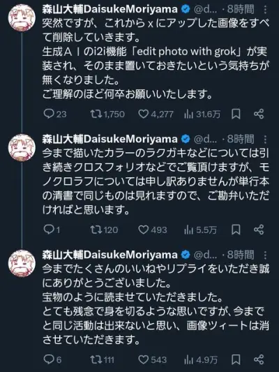 人気マンガ家「Xの画像全部消します。イラストも載せません。勝手に生成AIに使われたくないので。」