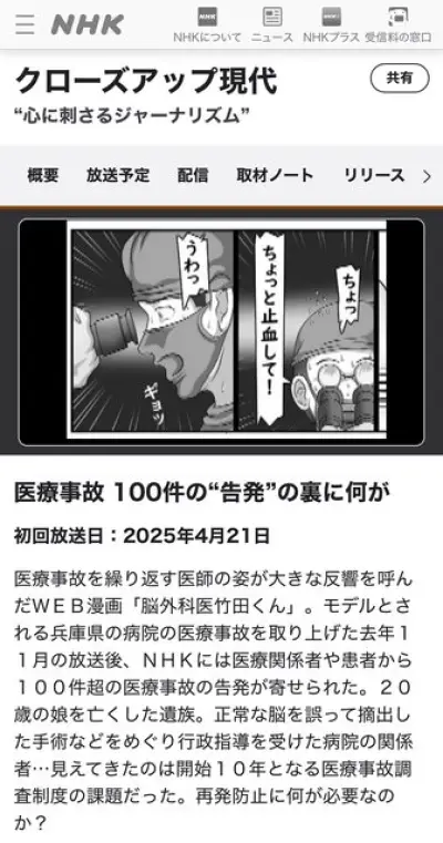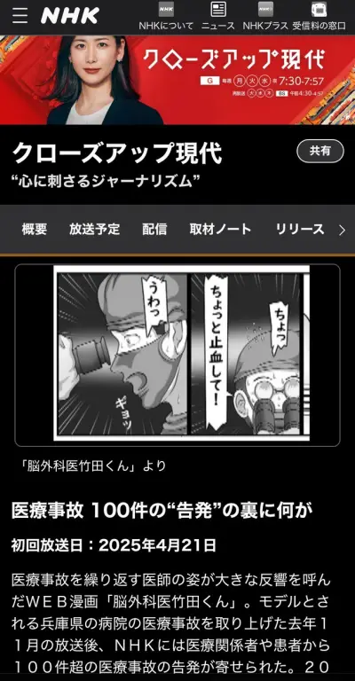 【朗報】4/21(月)のNHKクローズアップ現代で漫画「脳外科医 竹田くん」の特集が放送!