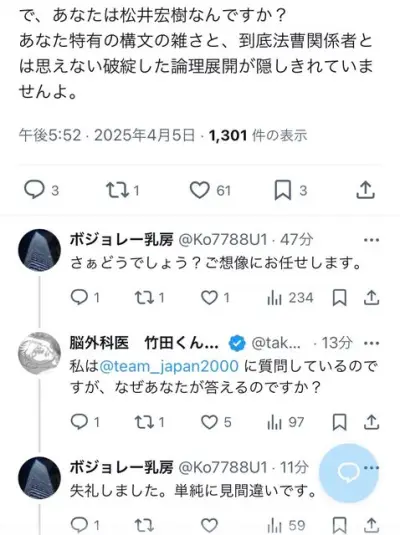 【悲報】「脳外科医 竹田くん」の擁護勢、なぜか別の擁護勢への質問にお返事してしまう