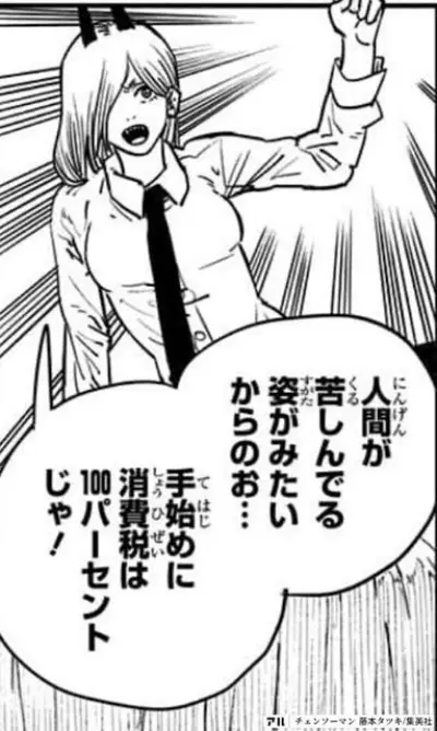 【画像】チェンソーマンのパワーちゃん「人間の苦しんでる姿が見たいから消費税100%じゃ!」