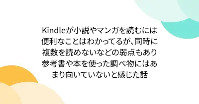 Kindleが小説やマンガを読むには便利なことはわかってるが、同時に複数を読めないなどの弱点もあり参考書や本を使った調べ物にはあまり向いていないと感じた話