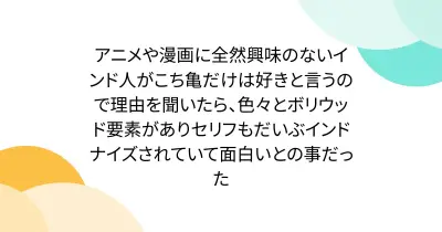 アニメや漫画に全然興味のないインド人がこち亀だけは好きと言うので理由を聞いたら、色々とボリウッド要素がありセリフもだいぶインドナイズされていて面白いとの事だった