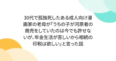 30代で孤独死したある成人向け漫画家の老母が「うちの子が河原者の商売をしていたのは今でも許せないが、年金生活が苦しいから相続の印税は欲しい」と言った話