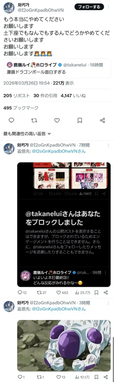 鷹嶺ルイ「ドラゴンボール面白すぎる」 DBファン「もう本当にやめてください。お願いします。土下座しますから」 →ブロック