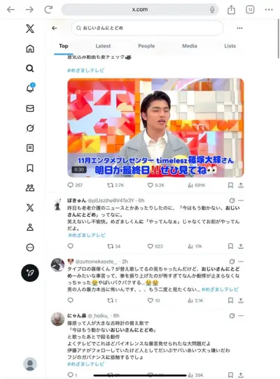 timelesz 篠塚大輝さん、めざましテレビで「今は、もう動かない、おじいさんにトドメ~」と一発ギャグを披露して炎上