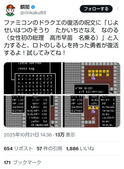 【画像】女性初の総理大臣「高市早苗」、ドラクエⅠで予言されていたwwwwwwwwwwww
